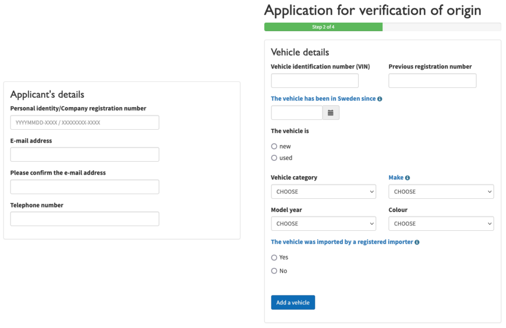 Damit nur legal erworbene Fahrzeuge ins Land gelangen und die möglichen Steuern abgeführt werden, ist im ersten Schritt eine Ursprungskontrolle notwendig. Das zuständige Transportstyrelsen („Amt für Transportwesen“) liefert hierzu alle notwendigen Informationen auf seiner Webseite. Aufgrund der hohen Auslastung, kann die Bearbeitungsdauer durchaus mehrere Wochen betragen, eine aktuelle Prognose ist online gelistet.