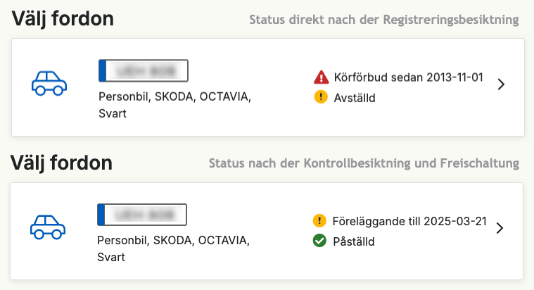 Sind die Kennzeichen eingetroffen und montiert, kann die Kontrollbesiktning („TÜV“) stattfinden. Die Terminvergabe erfolgt Online, wiederum bei einer zugelassenen Prüfstelle wie der DEKRA, Bilproving oder Carspect über die Eingabe des Kennzeichens. Die auch zukünftig alle 14 Monate fällige Kontrolle kostet grob zwischen 500 und 650 kr.