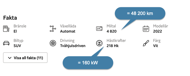 „Die Anzahl der PS ist keine Information, die im schwedischen Straßenverkehrsregister zu finden ist, sondern die Motorleistung des Fahrzeugs wird in Kilowatt (kW) erfasst.“ (Skatteverket)