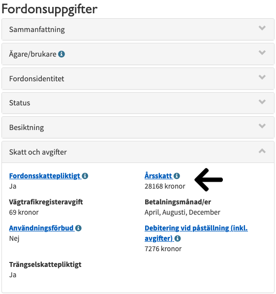 Um bösen Überraschungen nach dem Kauf vorzubeugen, gibt es drei Möglichkeiten: die manuelle Berechnung auf den Seiten des Skatteverket, auf Bilskatt oder über Fordonsuppgifter beim Transportstylreslsen. Nach Eingabe des Kennzeichens ist hier im Abschnitt „Skatt och avgifter“ jeweils die aktuelle Jahressteuer „Årsskatt“ ersichtlich. Bei vielen Autos ist Steuer in den ersten drei Jahren durch die Malus-Regel deutlich höher.