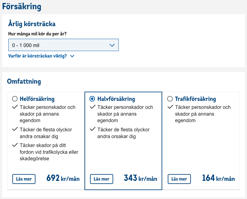 Die notwendige Haftpflichtversicherung (Trafikförsäkring) liegt für „normale“ Limousinen meist bei etwa 200 Kronen je Monat. Um schon vor dem Kauf die zukünftigen Kosten zu erfahren, bietet sich die Online-Berechnung von Länsförsäkringar an, die auch ohne schwedischen Führerschein funktioniert. Nach Eingabe des Nummernschildes und der eigenen Personnummer, erscheinen direkt die Preise für die Haftpflicht, sowie Teilkasko (Halvförsäkring), Vollkasko (Helförsäkring) und andere Extras.